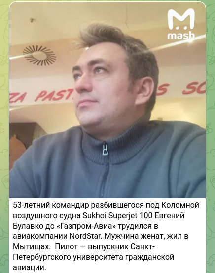 16:51. 53-летний командир разбившегося под Коломной воздушного судна Sukhoi Superjet 100 Евгений Булавко до "Газпром авиа" трудился в авиакомпании NordStar. Мужчина женат, жил в Мытищах. Пилот - выпускник Санкт-Петербургского университета гражданской авиации.