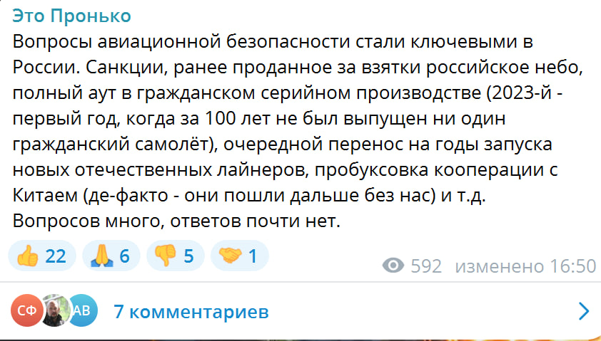 18:05 Экономический обозреватель Царьграда Юрий Пронько после крушения SSJ-100 в Подмосковье отмечает, что вопросы авиационной безопасности стали ключевыми в России. Он указывает, что есть проблемы и с технической частью, и с реализацией задуманного. Однако решения проблем авиавласти так и не предложили.