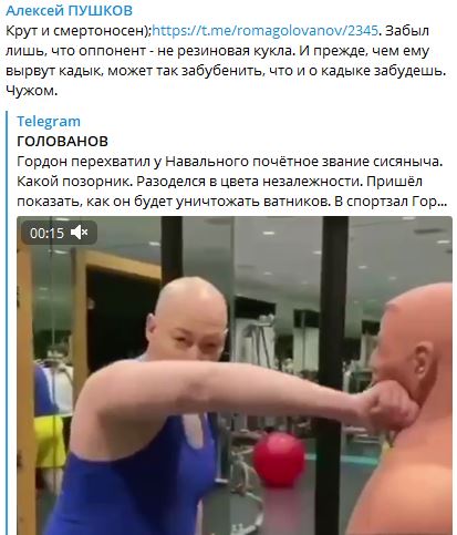 Гордон выложил видеозапись своей тренировки в спортзале, где он отрабатывает удары на манекене. Журналист дважды бьёт кулаком по манекену, а затем делает вид, что вырывает ему кадык.