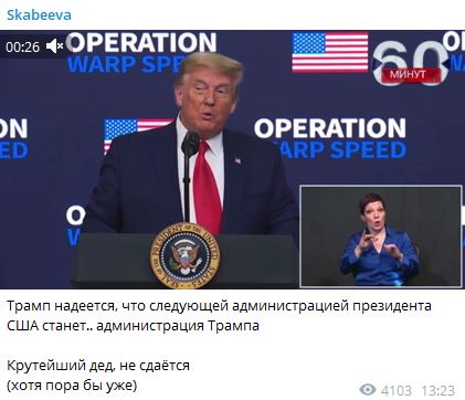 Президент США Дональд Трамп всё ещё надеется вернуться в Белый дом, несмотря на то, что официально победу на выборах присуждают Байдену. Скабеева восхитилась политиком: "Крутейший дед, не сдаётся".