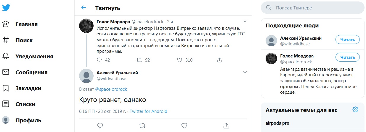 "Если соглашение по транзиту газа не будет достигнуто, украинскую ГТС можно будет заполнить... водородом. Похоже, это просто единственный газ, который вспомнился Витренко из школьной программы", - иронизирует в Twitter "Голос Мордора" @spacelordrock.