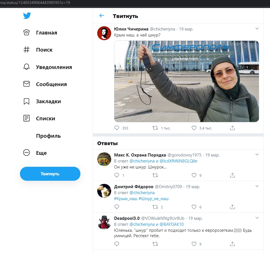 Юлия Чичерина не стала в деталях комментировать реплику Шнурова. Лишь задала короткий вопрос: "Крым наш, а чей шнур?" Так певица открыла большой "портал", собирая самые разные ответы. Были и в поддержку Шнурова, но всё чаще критического толка.