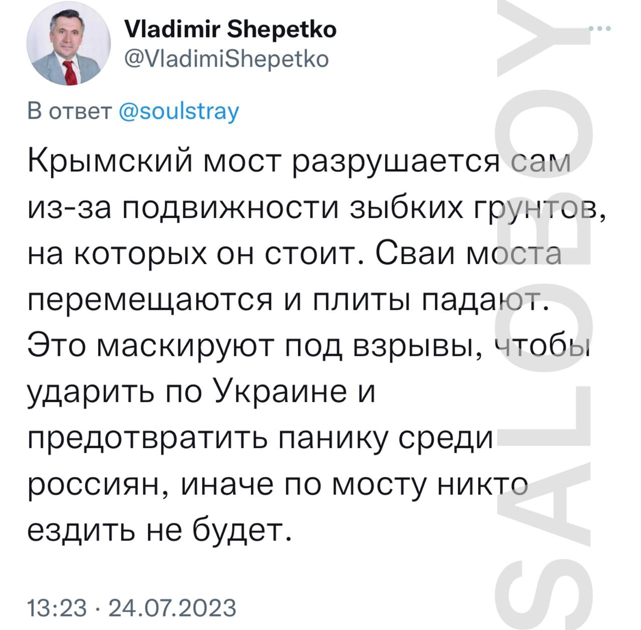 Теория, что Крымский мост разрушился по вине природных явлений, нашла новых последователей - украинский юрист Владимир Шепетько уверен, что Россия намеренно маскирует подвижность грунтов под взрывы, чтобы обвинить Украину.
