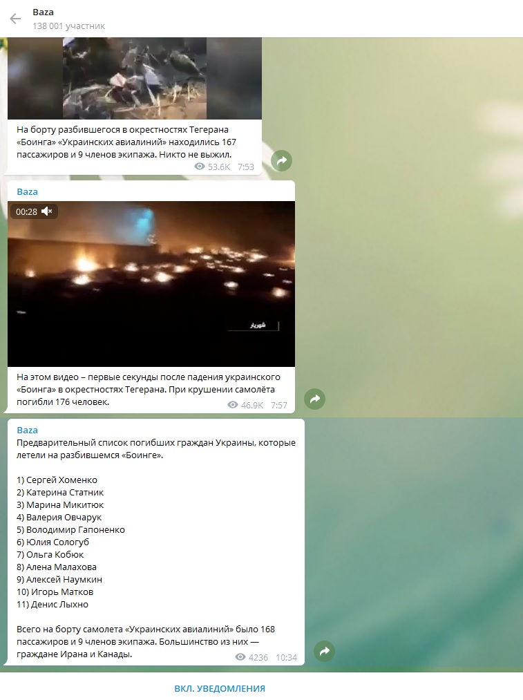 В результате крушения украинского Боинга в Иране погибли 168 пассажиров и девять членов экипажа. Большинство погибших - граждане Ирана и Канады. Однако экипаж был украинским, имена погибших с Украины распространяют в Сети.
