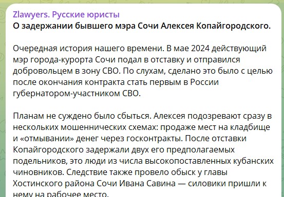 "После отставки Копайгородского задержали двух его предполагаемых подельников, это люди из числа высокопоставленных кубанских чиновников. Следствие также провело обыск у главы Хостинского района Сочи Ивана Савина - силовики пришли к нему на рабочее место", - пишет телеграм-канал "Zlawyers. Русские юристы".