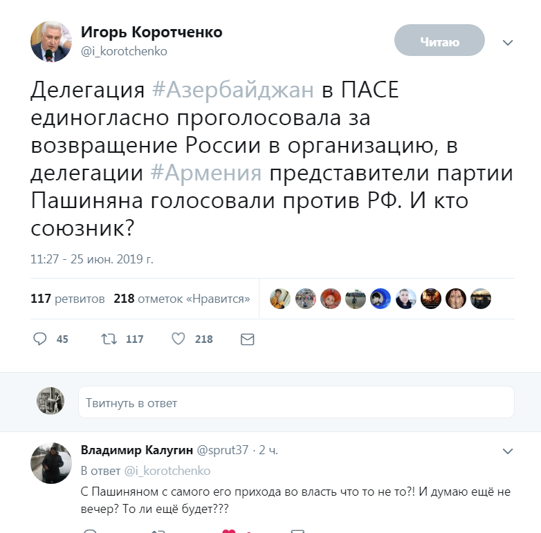 "Делегация Азербайджан в ПАСЕ единогласно проголосовала за возвращение России в организацию, в делегации Армения представитель партии Пашиняна голосовал против РФ. И кто союзник?"