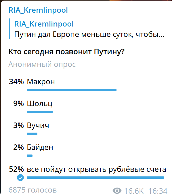 В Сети делают ставки, кто из западных лидеров решит напрямую с президентом России обсудить перевод оплаты за газ в рубли.