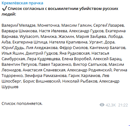 Автор Telegram-канала "Кремлёвская прачка", который выложил список выступающих против военной операции селебрити, отметил, что все они "согласны с восьмилетним убийством русских людей" в Донбассе. Ведь одна из целей этой операции - покончить с войной, которая идёт на Украине с 2014 года.