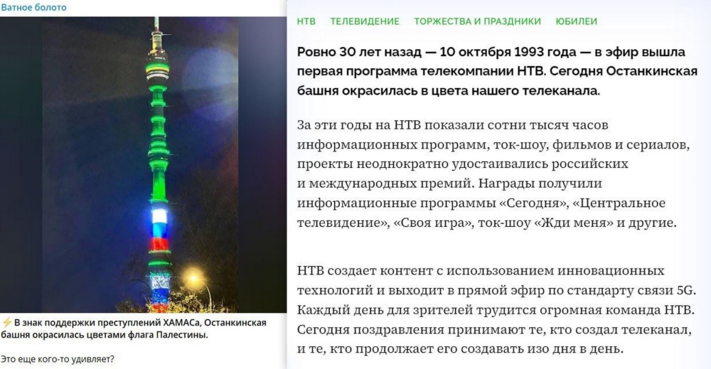 Останкинская башня в Москве окрасилась в цвета флага Палестины - ещё один вброс иностранных журналистов для извлечения личной выгоды. Хотя что-то подобное было, но не в разгар палестино-израильской войны, и не совсем в палестинские цвета окрашивалась знаменитая башня. Но именно с того события и подхватили фото в западных и украинских пабликах. 10 октября 1993 года исполнилось 30 лет с выхода первой программы телекомпании НТВ - Останкинская башня окрасилась в цвета телеканала в честь красивой даты.