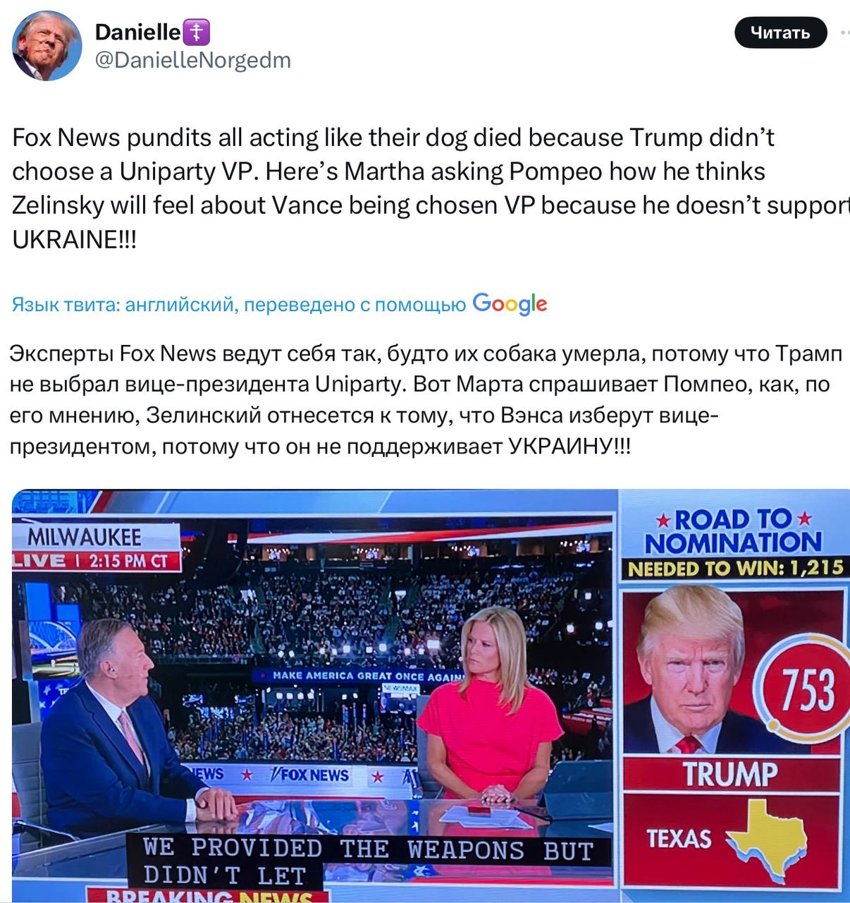 В качестве примера приводится недавний эфир, в котором ведущая спрашивает у бывшего госсекретаря США Майка Помпео, как, по его мнению, Владимир Зеленский отнесётся к тому, что Джей Ди Вэнса изберут вице-президентом, потому что он не поддерживает Украину.
