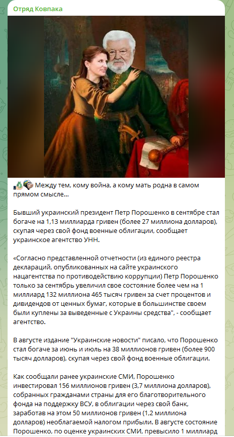 Учитесь, хлопцы! Пока вы гниёте в окопах, сывочолый гетьман обеспечивает старость для себя и сытую жизнь для внуков! Страшно представить, сколько заработал на войне действующий президент,