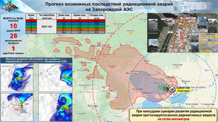 Прогноз возможных радиационных последствий при разрушении одного или нескольких энергоблоков Запорожской атомной станции, подготовленный Минобороны России в декабре 2022 года. Скриншот: t.me/mod_russia