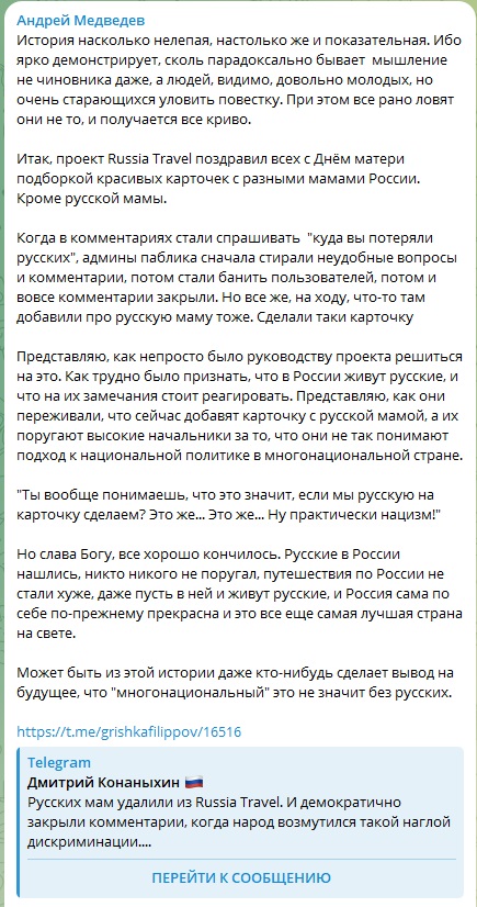 Об этом в телеграм-канале рассказал журналист, депутат Андрей Медведев. Он поведал историю, которая "насколько нелепая, настолько и показательная". Итак, проект Russia Travel (к слову, созданный в рамках нацпроектов России) решил креативно поздравить женщин нашей страны с Днём матери, который в этом году отметили 26 ноября.