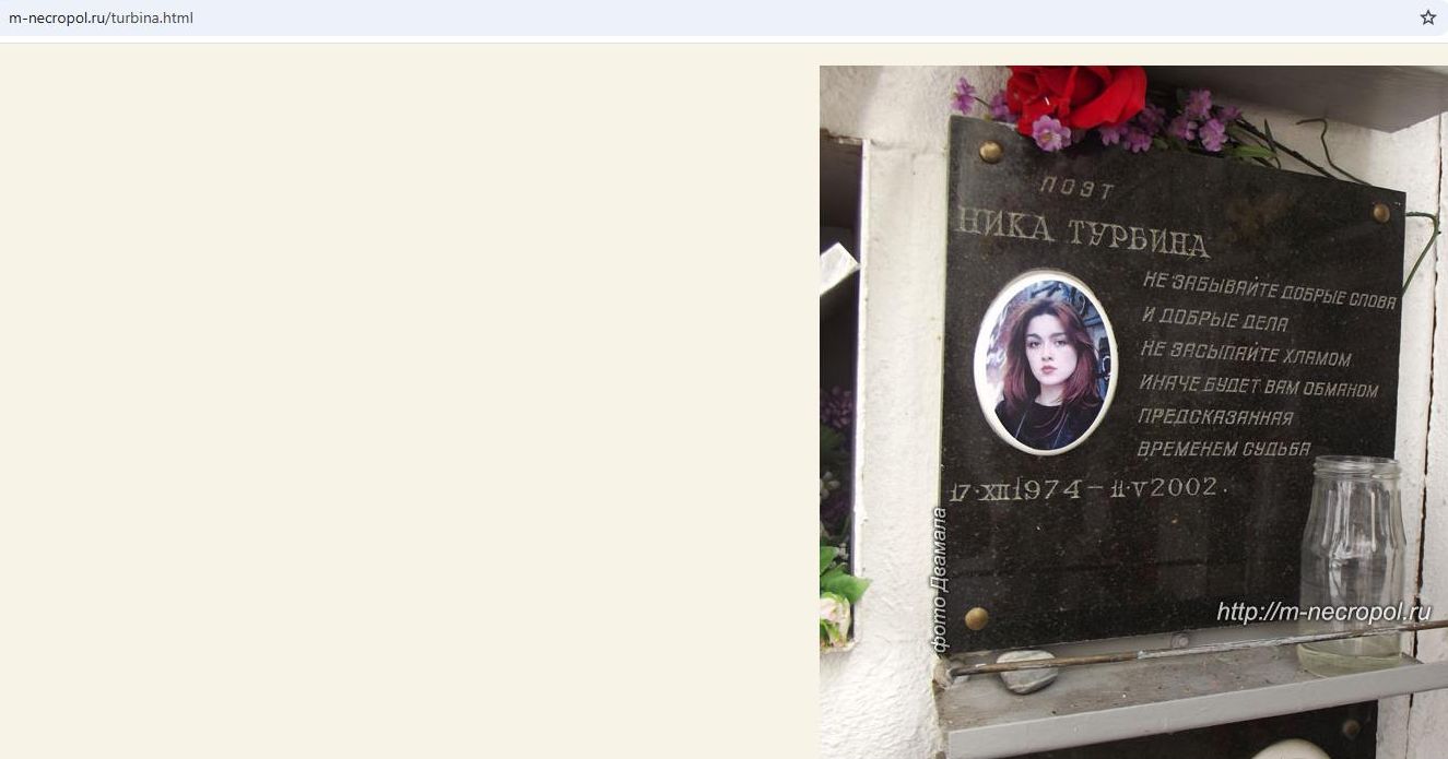 Могила Ники Турбиной на Ваганьковском кладбище. Скриншот: интернет сайт https://www.m-necropol.ru/turbina.html