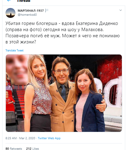 Убитая горем блогерша - вдова Екатерина Диденко (справа на фото) - сегодня на шоу у Малахова. Позавчера погиб её муж. Может, я чего не понимаю в этой жизни?