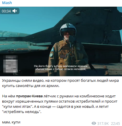 Далее он обвиняет Россию в том, что делали ВСУ в Донецке и Макеевке, - в сбрасывании кассетных бомб на жилые дома и школы. Назвавший себя "небесной карой" пилот обещает спонсору уничтожать русские танки и бронетехнику. После этого украинский "герой" садится в новенький истребитель, очень похожий на русский Су-27, и улетает.