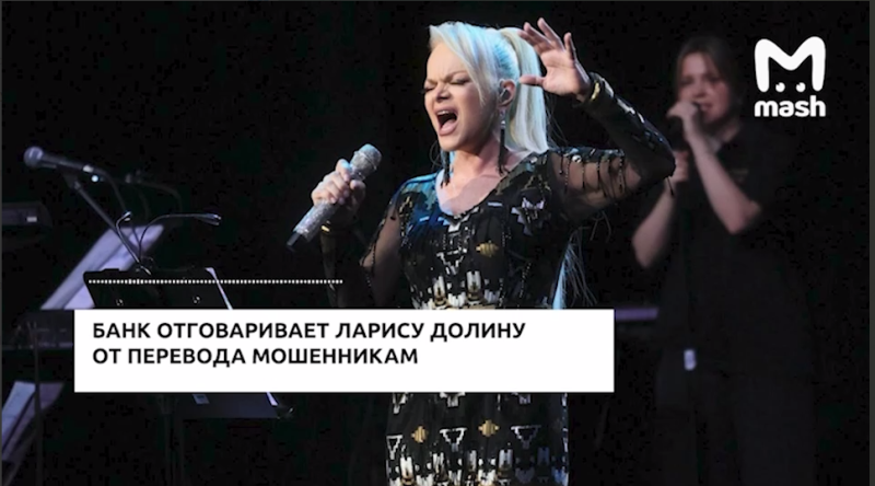 В Сети появилась запись телефонного разговора певицы Ларисы Долиной с представителями банка. Несмотря на предостережения банковских служащих о нежелательности осуществления денежных переводов, певица утверждала, что все предпринимаемые ею действия совершаются исключительно по её собственному желанию. Как выяснилось позже, артистка стала жертвой обманщиков.
