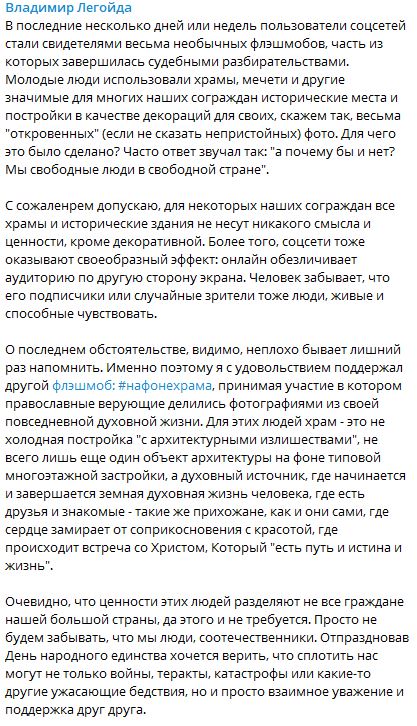 Председатель Синодального отдела по взаимоотношениям Русской Православной Церкви с обществом и СМИ Владимир Легойда признался, что поддержал новый флешмоб верующих, получивший название #нафонехрама. Он отметил, что для православных храм - это не просто объект архитектуры, а духовный источник, где начинается и завершается земная духовная жизнь человека.