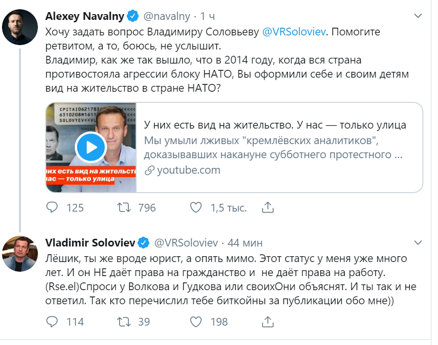 После этого в соцсетях Соловьев прокомментировал эту информацию и призвал Навального "не позориться". Телеведущий буквально сошелся в Twitter-поединке с оппозиционером.