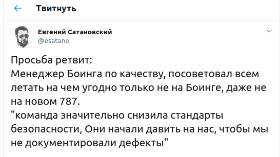 В последнее время всё больше откровений сотрудников американской компании Boeing появляется в СМИ и в Сети. На этот раз ложку дёгтя добавил менеджер по качеству Джон Барнетт, проработавший 30 лет в компании. Его цитату приводит у себя на странице в соцсети Twitter политолог Евгений Сатановский, прося подписчиков о ретвите сообщения.