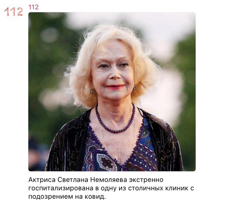 Актрису Светлану Немоляеву госпитализировали с положительным тестом на коронавирус. Об этом артистка рассказала 360.ru, сообщив также, как себя чувствует. По её словам, болезнь её не пугает, так как сейчас ковид лечится проще и быстрее, чем в пандемийные времена.