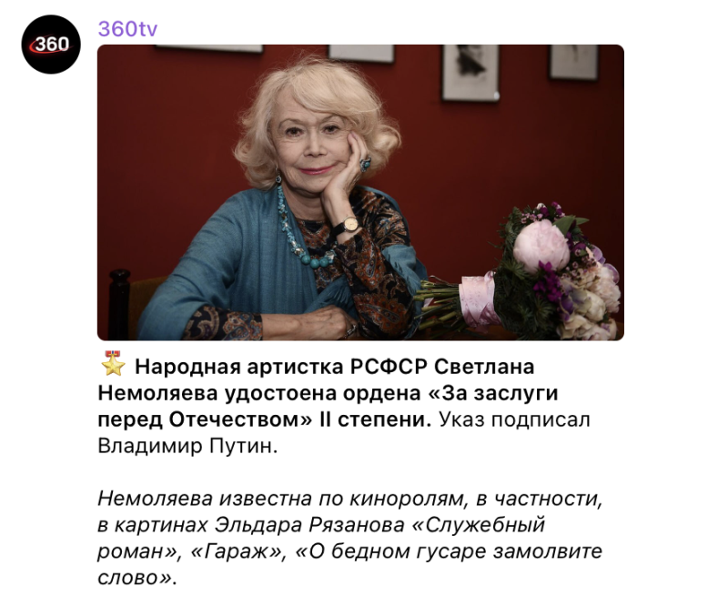 Вклад Светланы Немоляевой в культуру страны признан на государственном уровне. Так, год назад актриса получила орден "За заслуги перед Отечеством". Скриншот: t.me/tv360