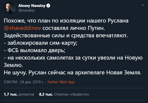 "Заблокировали сим-карту; ФСБ выломала дверь; на нескольких самолётах за сутки увезли на Новую Землю. Не шучу. Руслан сейчас на архипелаге Новая Земля", - написал Навальный.
