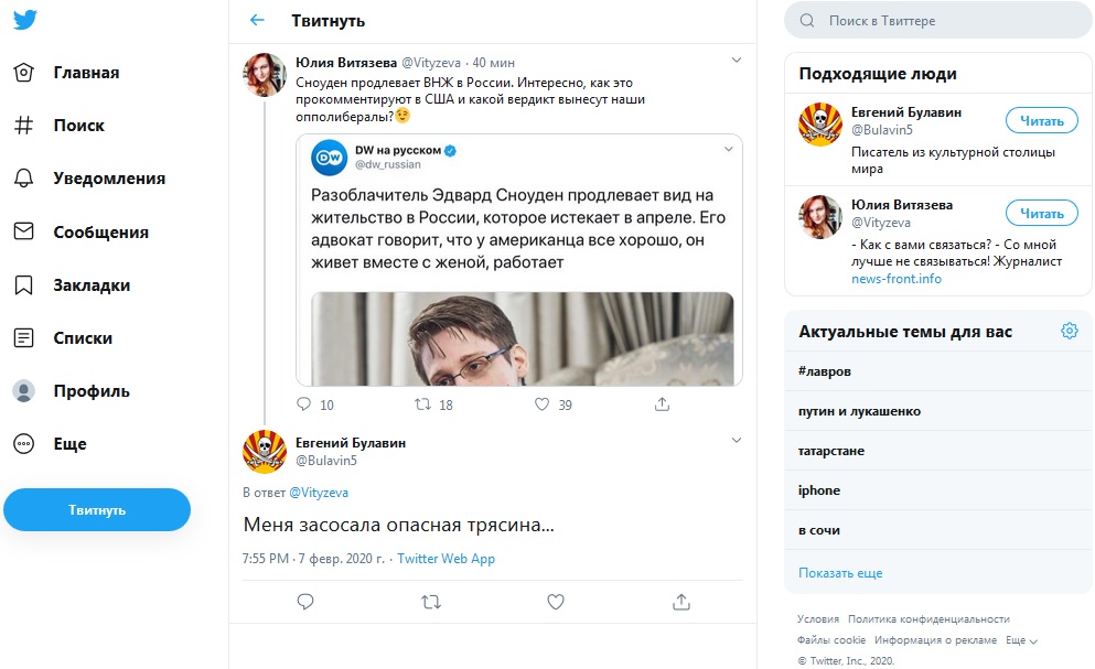 "Сноуден продлевает ВНЖ в России. Интересно, как это прокомментируют в США и какой вердикт вынесут наши опполибералы?" - комментирует новость в Twitter журналистка и блогер Юлия Витязева.