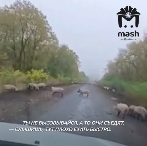На видеозаписи запечатлён проезд бойцов ВС России по дороге, заполненной свиньями. Судя по всему, в ходе боевых действий один из прилётов пришёлся по свинарнику, в котором скрывались боевики ВСУ. После удара все они разбежались, как и поросята.