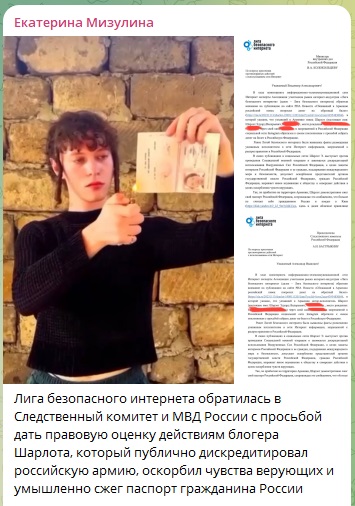 Тем временем Лига безопасного интернета обратилась в Следственный комитет и МВД России с просьбой дать правовую оценку действиям блогера, в том числе и странной акции с паспортом. По мнению Лиги, в действиях Шарлота усматривается публичная дискредитация армии России и оскорбление чувств верующих.