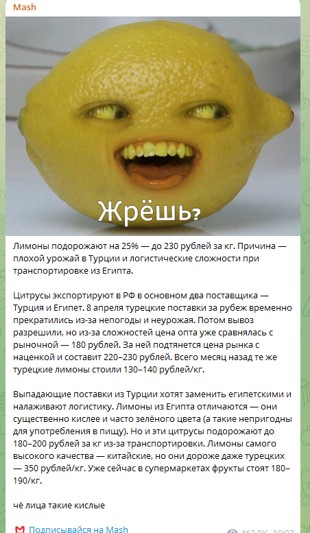 Выручить мог бы второй крупный экспортёр лимонов – Египет. Но там свои нюансы: сильно затруднена доставка товара оттуда в нашу страну. К тому же египетские лимоны похуже турецких. Они часто зелёные, и сильно кислые.