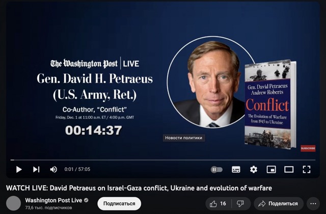 Петреус также признал, что Украина не достигла того, на что рассчитывала во время летнего наступления, в частности из-за задержки поставок вооружений от западных стран. Главком ВСУ Валерий Залужный незадолго до этого заверял, что ситуация на фронте зашла в тупик и украинская армия не смогла добиться значимых успехов в течение полугода контрнаступления.
