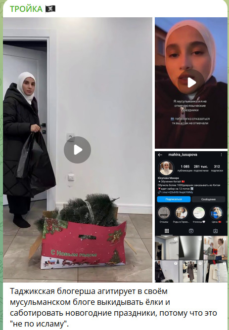 Блогерша из Таджикистана по имени Махира получила русский паспорт и активно агитирует против новогодних праздников. Она считает, что это "не по исламу" и призывает выкидывать ёлки. Махира живёт у "друга" в качестве второй жены и воспитывает с его настоящей супругой троих общих детей, все они - граждане России.