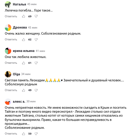 "Очень неприятная новость. Не имею возможности съездить в Крым и посетить "Тайган" и поэтому много видео пересмотрел. Леокадия столько сил отдала животным "Тайгана", столько котят, от которых самки хищников отказались, из бутылочки выкормила. Право, какая-то большая несправедливость в происшедшем… Соболезнование родным", - высказался Алекс А.