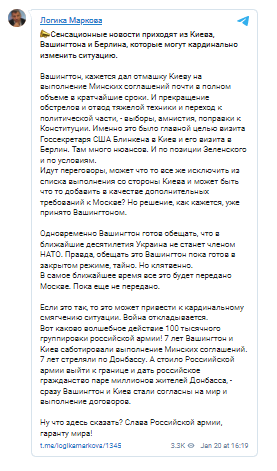В зашедшем в тупик мирном процессе по Донбассу, кажется, наметился серьёзный прорыв. Политолог Марков сообщил, что США, по предварительным данным, дали отмашку Украине начать выполнять Минские соглашения после семи лет их бойкотирования. Речь идёт как про военную (отвод техники, прекращение огня, обмен пленными), так и про политическую (особый статус, выборы, амнистия) части.