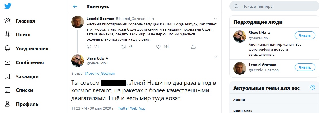 Леонид Гозман порадовался запуску американского Crew Dragon и выразил надежду, что Россия когда-нибудь тоже так сможет. "Ты совсем, Лёня? Наши по два раза в год в космос летают, на ракетах с более качественными двигателями", - напомнили ему в комментариях.