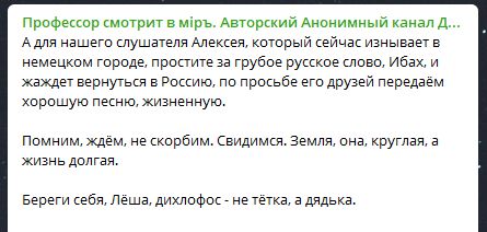 Автор Telegram-канала "Профессор смотрит в мiръ", подражая радиоведущим, передал "хорошую песню, жизненную". Разумеется, был указан и адресат - слушатель Алексей, изнывающий на данный момент в немецком городе Ибах (Евстафьев не забыл извиниться за грубое слово). Алексей "жаждет вернуться в Россию", а просьба о песне поступила от его друзей.