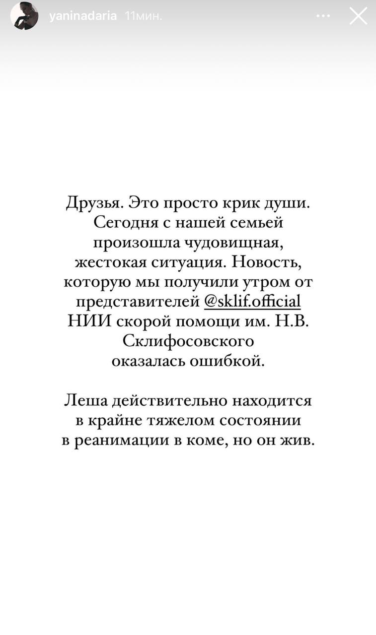 "Сегодня с нашей семьёй произошла чудовищная, жестокая ситуация, - написала Дарья, супруга актёра. - Новость от НИИ скорой помощи им. Н.В. Склифосовского оказалась ошибкой".