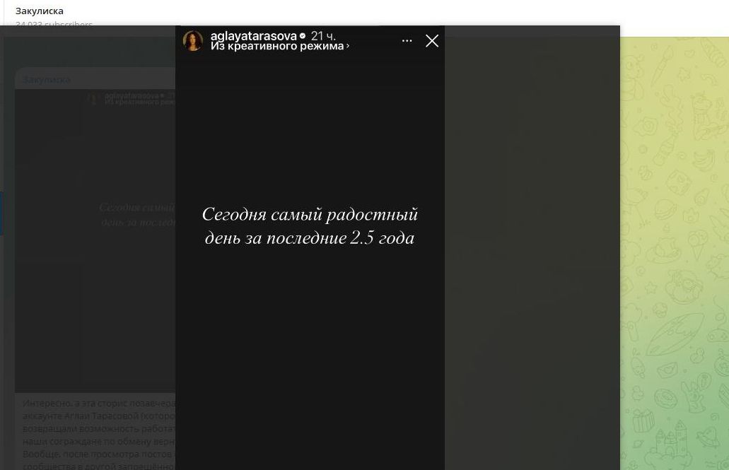Вроде бы невинное сообщение: но "радостный день" странным образом "совпал" с обменом на русских разведчиков нескольких деятелей отечественной оппозиции. А "последние 2,5 года" - очевидная отсылка к проведению СВО. Так что теперь уже нет сомнений, каково отношение Аглаи Тарасовой к спецоперации и какие события доставляют ей радость…