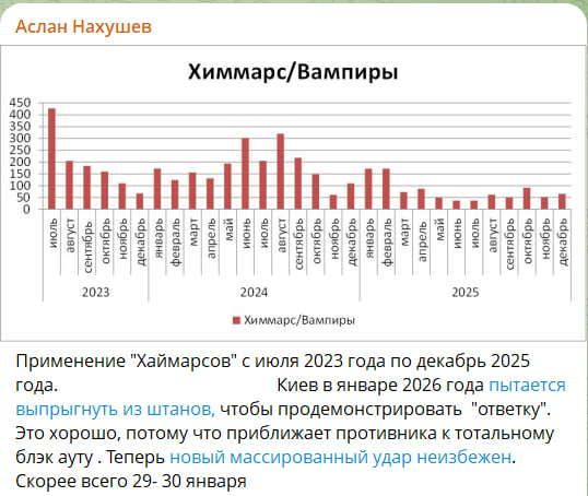 В ночь на 26 января продолжаются атаки по тыловым районам Украины. Рои "Гераней" наиболее интенсивно на протяжении нескольких часов бьют по н.п. Недригайлов и Ахтырка в Сумской области и Вольногорску Днепропетровской области. Цели пока неизвестны.
