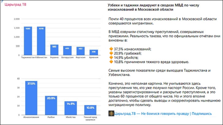 Наглядно о мигрантской преступности. Скрин поста ТГ-канала "Царьград ТВ"