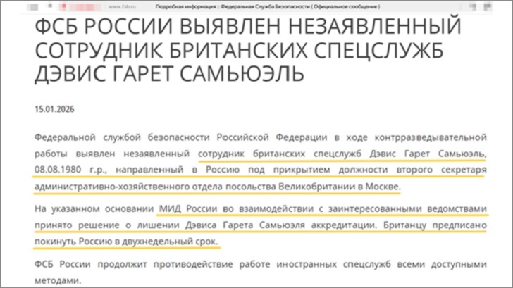 На днях ФСБ вскрыла очередного "дипломата" - Гарета Самьюэла Дэвиса, который официально занимал должность второго секретаря административно-хозяйственного отдела посольства Великобритании, а на деле является сотрудником британских спецслужб под прикрытием. Ему дали две недели на то, чтобы собраться и покинуть страну.