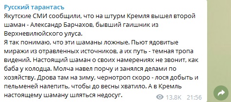 Новость о втором шамане, якобы отправившемся в Москву, чтобы "изгнать Путина" (президента России Владимира Путина. - Ред.), оказалась фейком. Впрочем, о подобном исходе писал и военкор Дмитрий Стешин в своем авторском телеграм-канале "Русский тарантасъ".