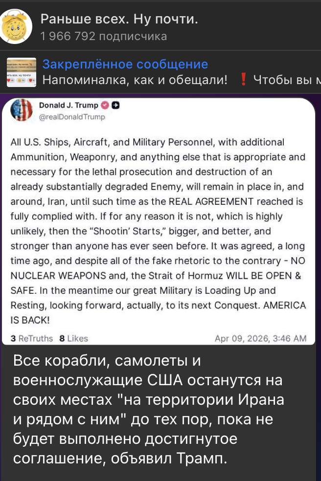 Напомним, в ночь на среду Дональд Трамп объявил о двухнедельном перемирии с Ираном. Он отметил, что Штаты получили от Тегерана предложение из 10 пунктов, которое могло бы стать основой для переговоров. Иранский Высший совет национальной безопасности тут же провозгласил триумф: американцы якобы приняли все условия, включая сохранение контроля над Ормузским проливом, выплату компенсаций, отмену санкций, разрешение на обогащение урана и вывод войск с Ближнего Востока. Associated Press добавляет: по плану перемирия Иран и Оман начнут брать плату за проход судов через пролив.