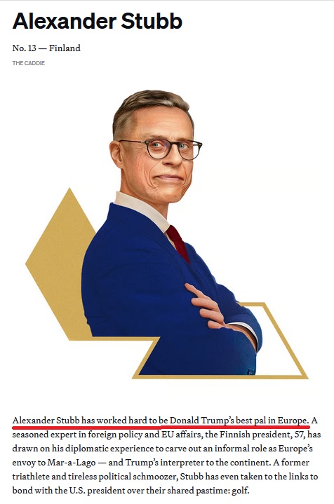 При этом в конце 2025 года американское издание Politico назвало президента Финляндии Александра Стубба "лучшим другом" Дональда Трампа в Европе. Благодаря общему увлечению гольфом и успешным контрактам, он смог наладить отношения лучше других европейских лидеров, отмечалось в материале.