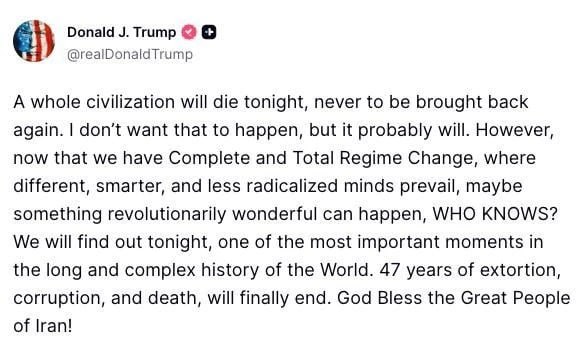 Ранее президент США опубликовал сообщение, в котором пригрозил уничтожить Иран, как цивилизацию, за одну ночь, если Ормузский пролив не будет разблокирован. МИД Финляндии назвал такую риторику недопустимой.