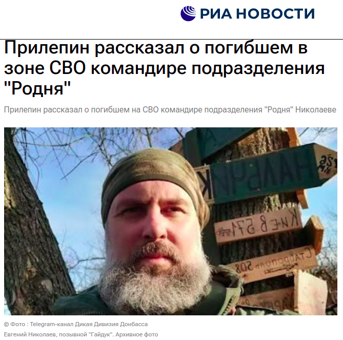 Командир отряда "Родня" Евгений Николаев с позывным "Гайдук" пал на боевом задании, вытаскивая тяжелораненого бойца из-под обстрела. Гибель легендарного разведчика прокомментировал его друг, писатель Захар Прилепин: "Лучший тип русского мужчины".