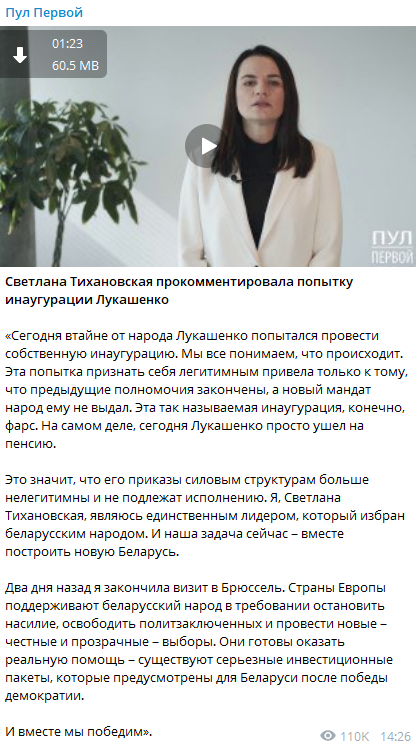 Эта так называемая инаугурация, конечно, фарс. На самом деле сегодня Лукашенко просто ушёл на пенсию. Я, Светлана Тихановская, являюсь единственным лидером, который избран белорусским народом, - пишет оппозиционерка в Telegram.