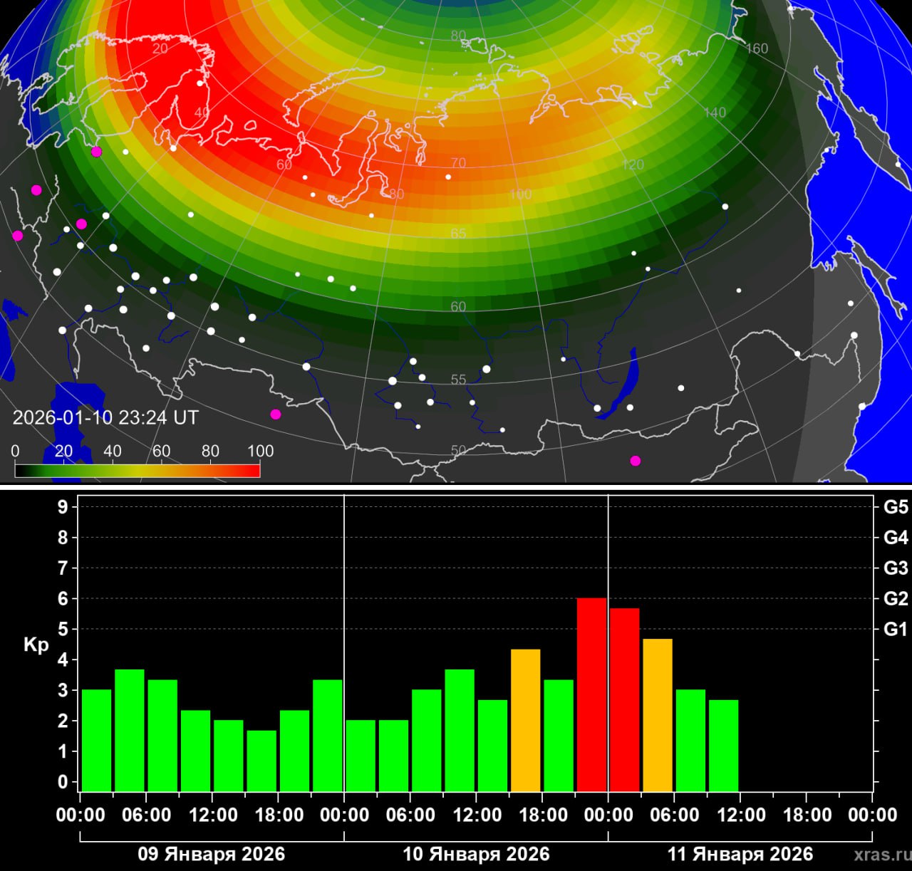 Земля испытала значительное геомагнитное возмущение в ночные часы 11 января, которое стало вторым с начала нового года. Событие сопровождалось яркими полярными сияниями, распространившимися до необычно низких широт.