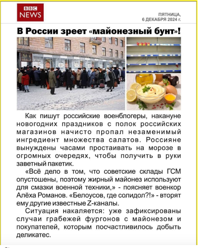 А уж рассказы про грабёж фур с майонезом и огромные очереди в магазинах, где люди стоят часами, чтобы урвать пачку соуса, и вовсе выдают фейк-ньюс с головой. Конечно, материал намеренно сделан так, чтобы в нём сразу опознали шуточный. Но по Сети расходятся обрезанные версии: заголовок, значок "Би-би-си" и маленький кусочек текста способны ввести неискушённого читателя в заблуждение.